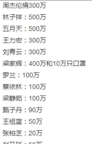 华语乐坛天王周杰伦在疫情期间也毫不吝啬,捐款500万元支持武汉。他还表示,自己会继续关注疫情发展,为抗击疫情贡献自己的力量。
